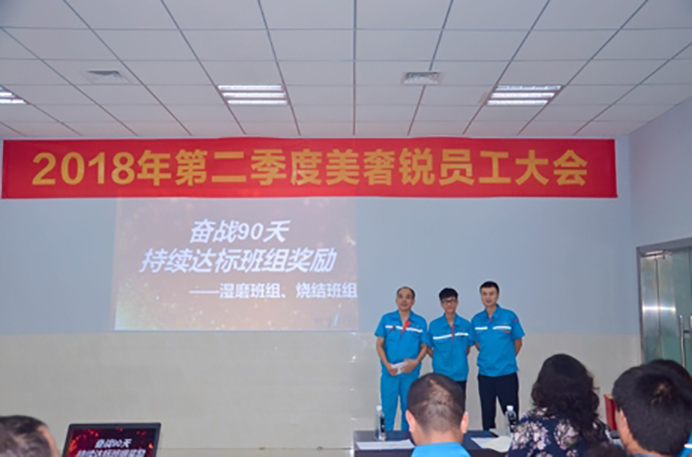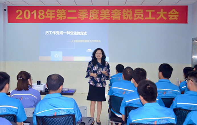 大会第一项议程,由总经理颜焰发表讲话。首先,颜总对全体员工的辛勤工作态度表示衷心感谢,接着,她针对美奢锐第二季度工作做了总结汇报,充分肯定大家所取得的各项成绩,在第二季度“奋战九十天”的方针下,公司实现了产能2.8倍增长,销售2.6倍增长的喜人成绩。这在目前全球市场激烈的情况下是非常难得的成绩,为美奢锐实现更进一步的奋斗目标和今后的快速发展奠定了良好基础。但同时指出不足之处不容忽视,希望大家做好本职工作,再接再厉,再创佳绩。并对下半年的工作提出了几点合理化建议,包括生产管理、服务改进、文化建设等内容。
